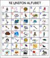 Printable chart of unifon_characters - A colorful chart with pictures, characters and words in UNIFON. It may also be found on this webpage http://www.unifon.org/unifon%20htm/alphabet.htm